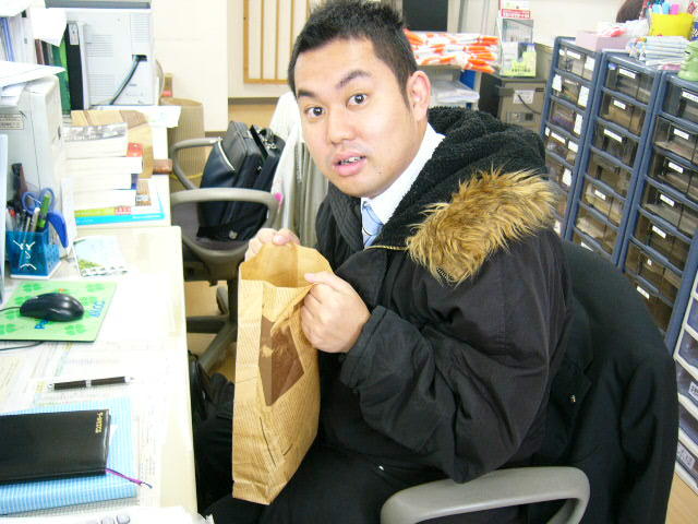 早速、開けて食べようとするみなっち。仕事しろよ!