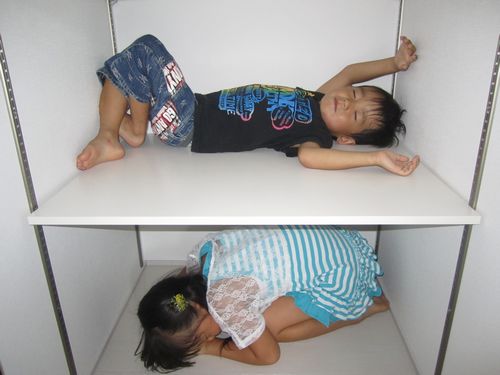 かくれんぼで棚の中に隠れている2人