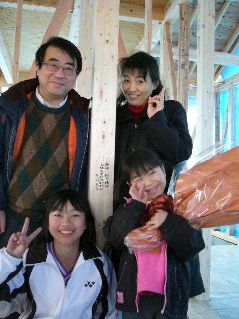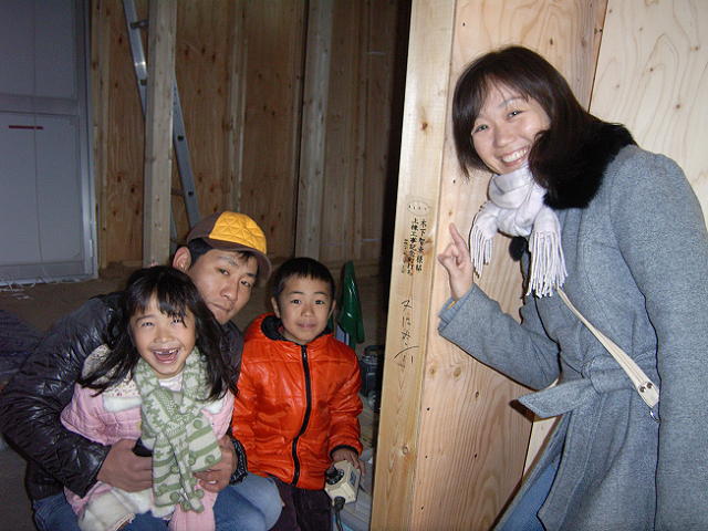 ご家族の見守る中真剣に釘を打つご主人様 記念の柱の前ではい、チーズ!