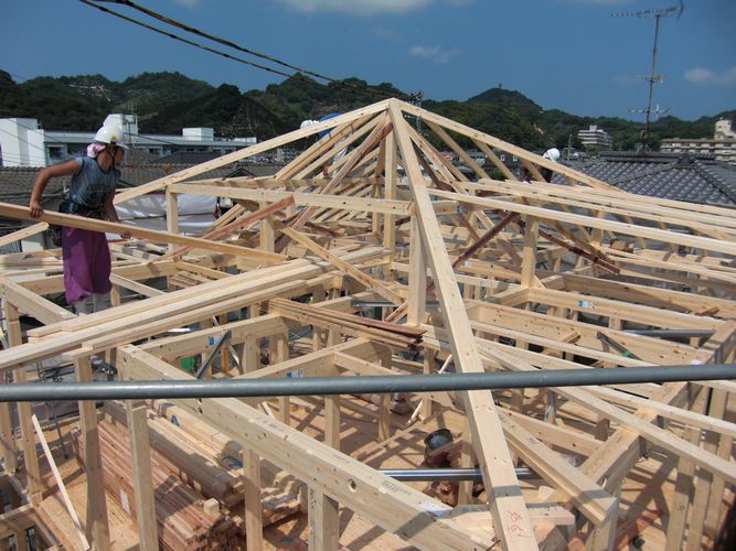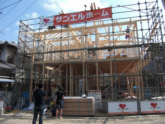9月24日(水) 上棟この日の上棟は、徳永棟梁を筆頭に、7人の大工さんで行われました。