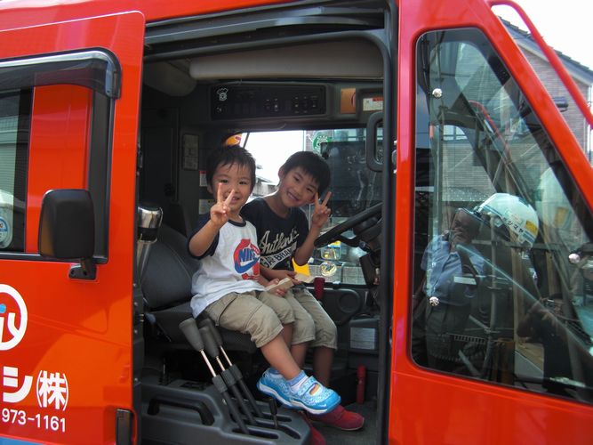 お子様は、兄弟仲良く余った木材に釘を打ち込んだり、三好主任にクレーン車
