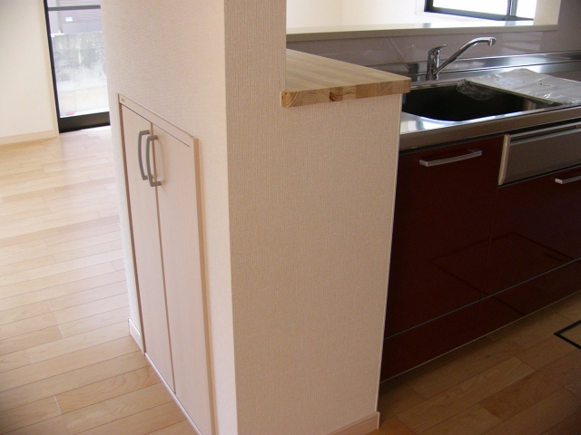 キッチン横の食洗機置場は、反対側を収納にして空間を有効活用しています