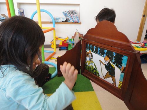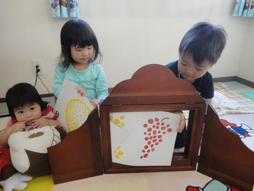 紙芝居の世界から、はやと君とみゆちゃんが出てきました