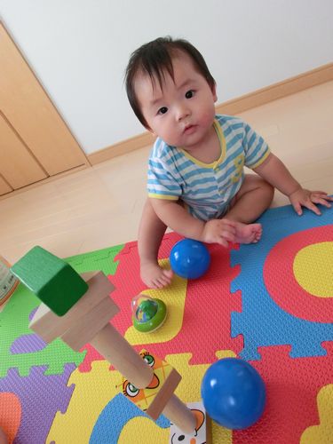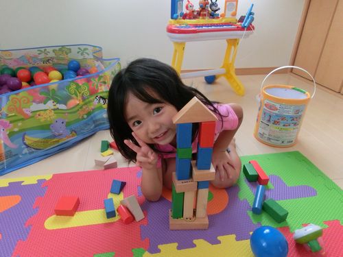 とわちゃんと私がつみきを積んで、それをとおまくんが壊す