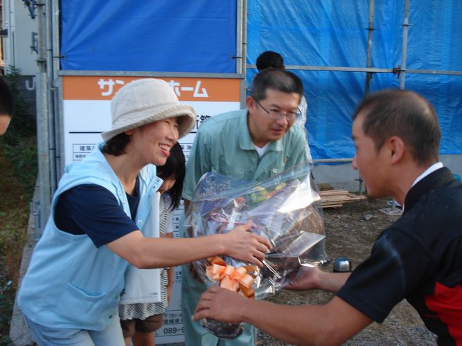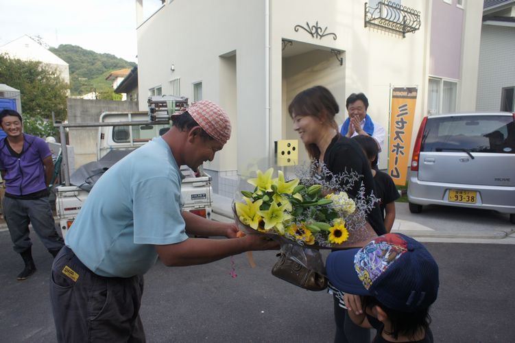 渡辺棟梁からお花のプレゼントと1日工事を頑張ってくれた大工さん達と記念写真